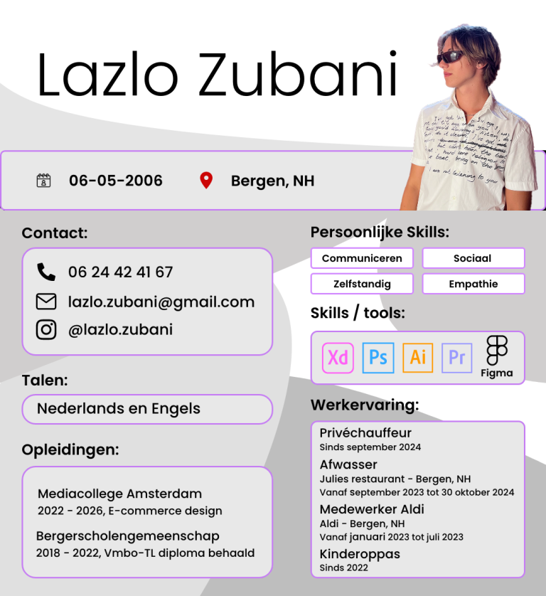 Mijn naam is Lazlo Zubani. Ik ben 18 jaar oud en ik woon in Bergen. Ik hou van muziek, fashion en sporten. Ik doe de studie e-commerce design op het mediacollege. Ik heb mijn vmbo diploma gehaald op de bsg in Bergen. Welkom op mijn portfolio.