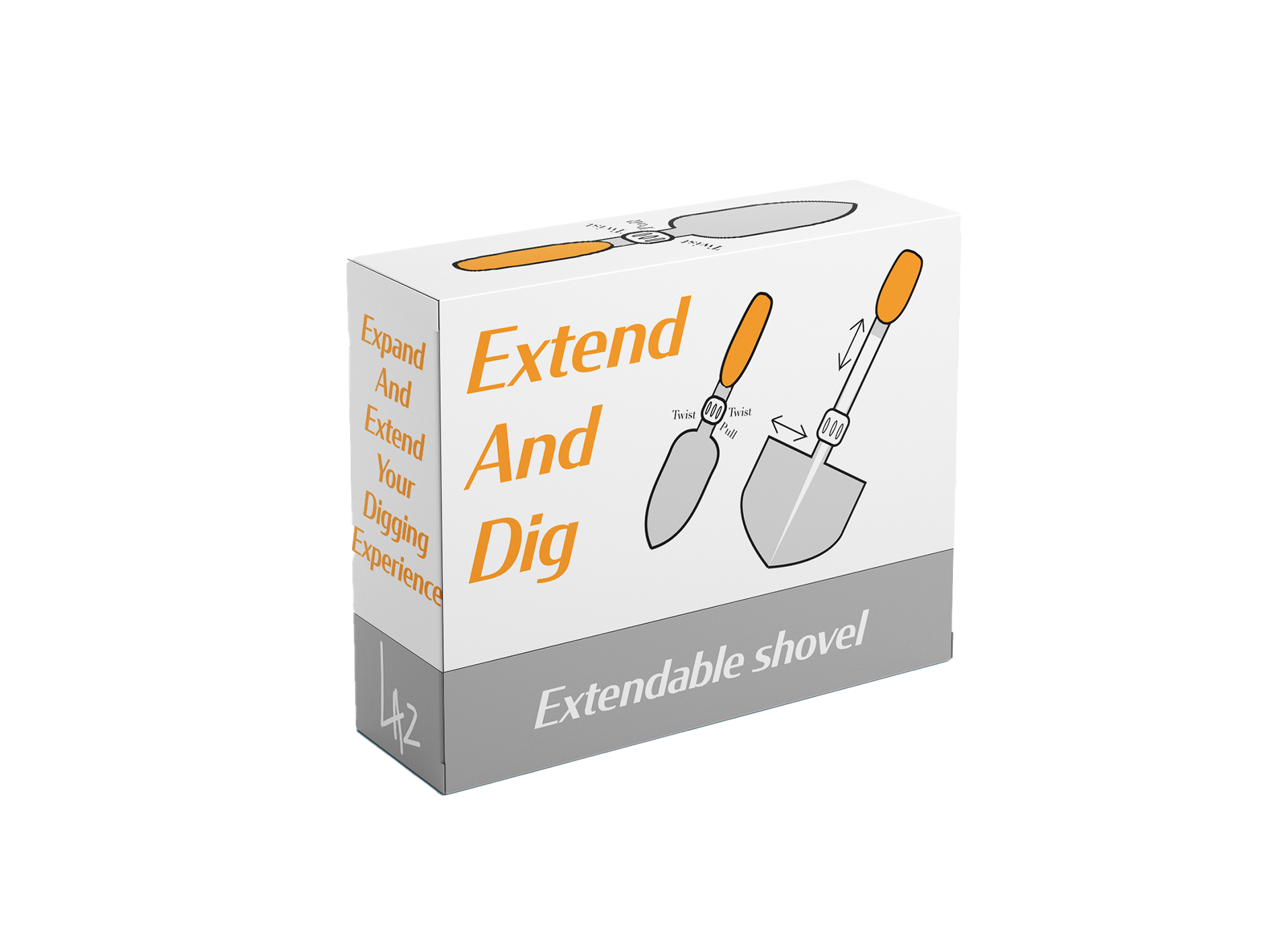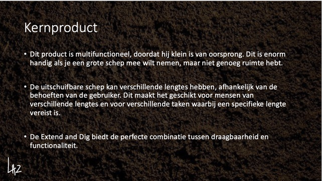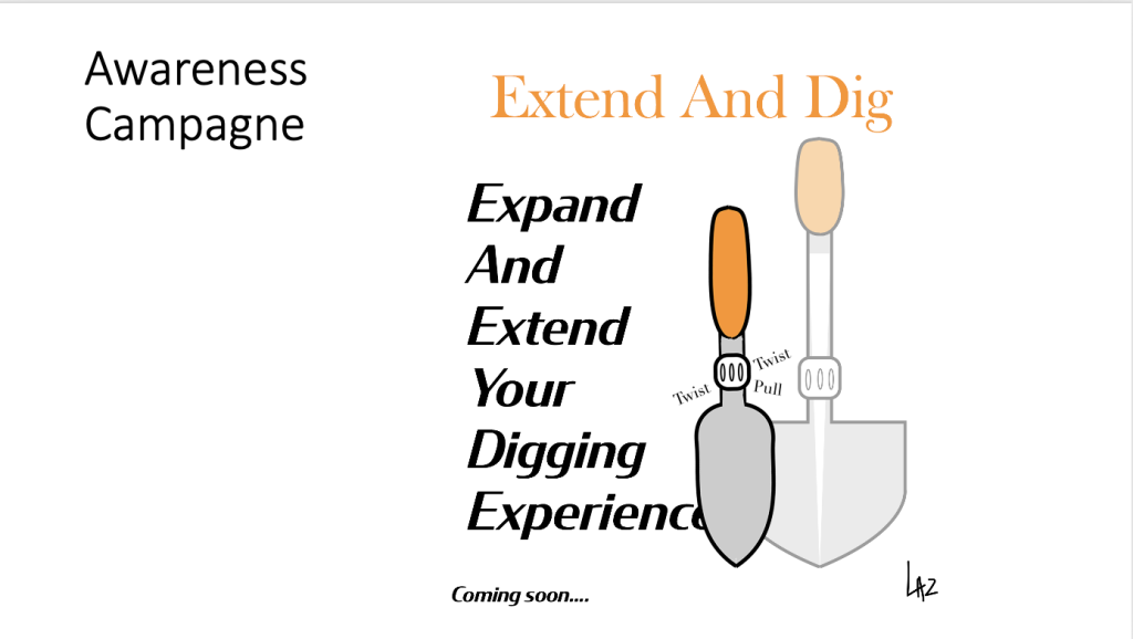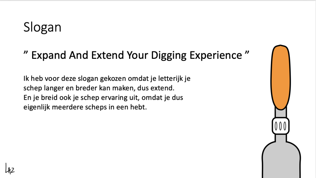 We mochten een product bedenken en visualiseren, ik heb een schep bedacht genaamd de Extend and Dig (uitschuifbare schep). Het unieke aan deze uitschuifbare schep is dat niet alleen de stang/hendel langer wordt, maar ook de schep zelf word breder, wat natuurlijk enorm handig is. Dit is handig voor doelgroepen zoals: Tuiniers, Ski rescue of nooddiensten.
