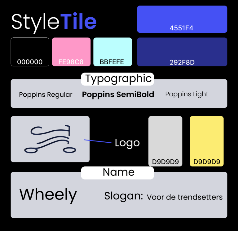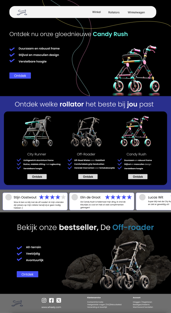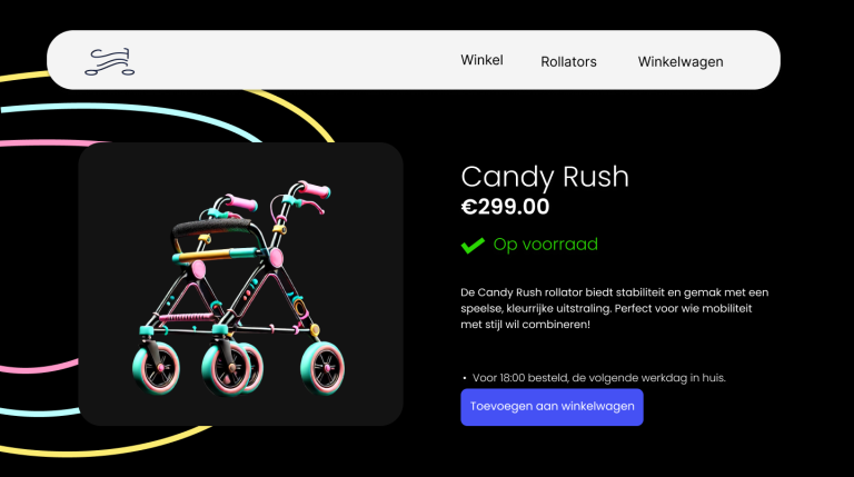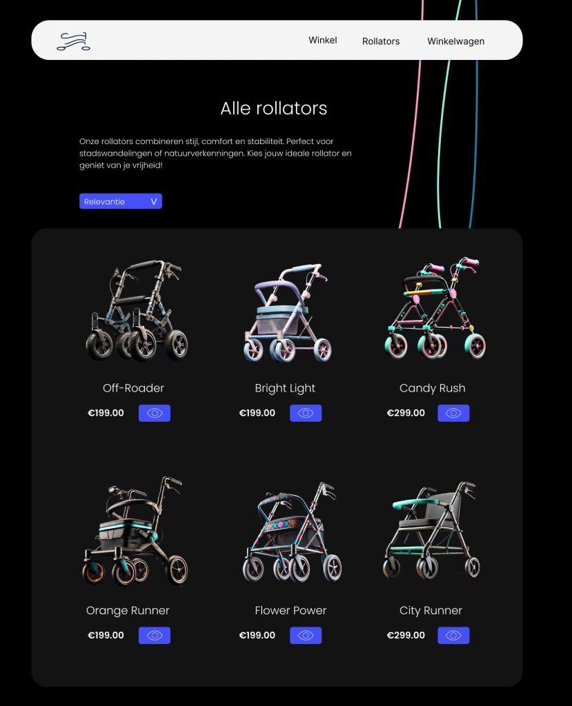 De doelgroep die ik heb gekozen voor mijn product is mensen tussen de 15 en 25 met een mobiliteitsbeperking. De doelgroep is niet breed, maar dit zijn leeftijden waar smaken erg snel veranderen. Iemand van 22 vind bijvoorbeeld hele andere dingen mooi in vergelijking met iemand van 15. Daarom ben ik voor een zwarte achtergrond gegaan, waarbij er felle elementen op de achtergrond word weergegeven om het wel op te kleuren, en daadwerkelijk dat blije gevoel te brengen wat ook de bedoeling is van de rollators.